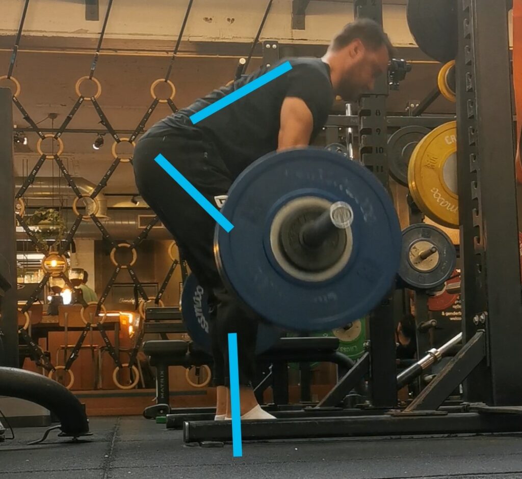 - Brengt je heupen op de juiste hoogte. Dit zal per persoon weer net anders zijn vanwege verschillende lichaamsverhoudingen. De blauwe lijnen laten de hoeken zien waarin mijn persoonlijke ideale startpositie is. Hierbij heb ik mijn schouders over de stang. Dit is essentieel voor een goede startpositie van een deadlift.